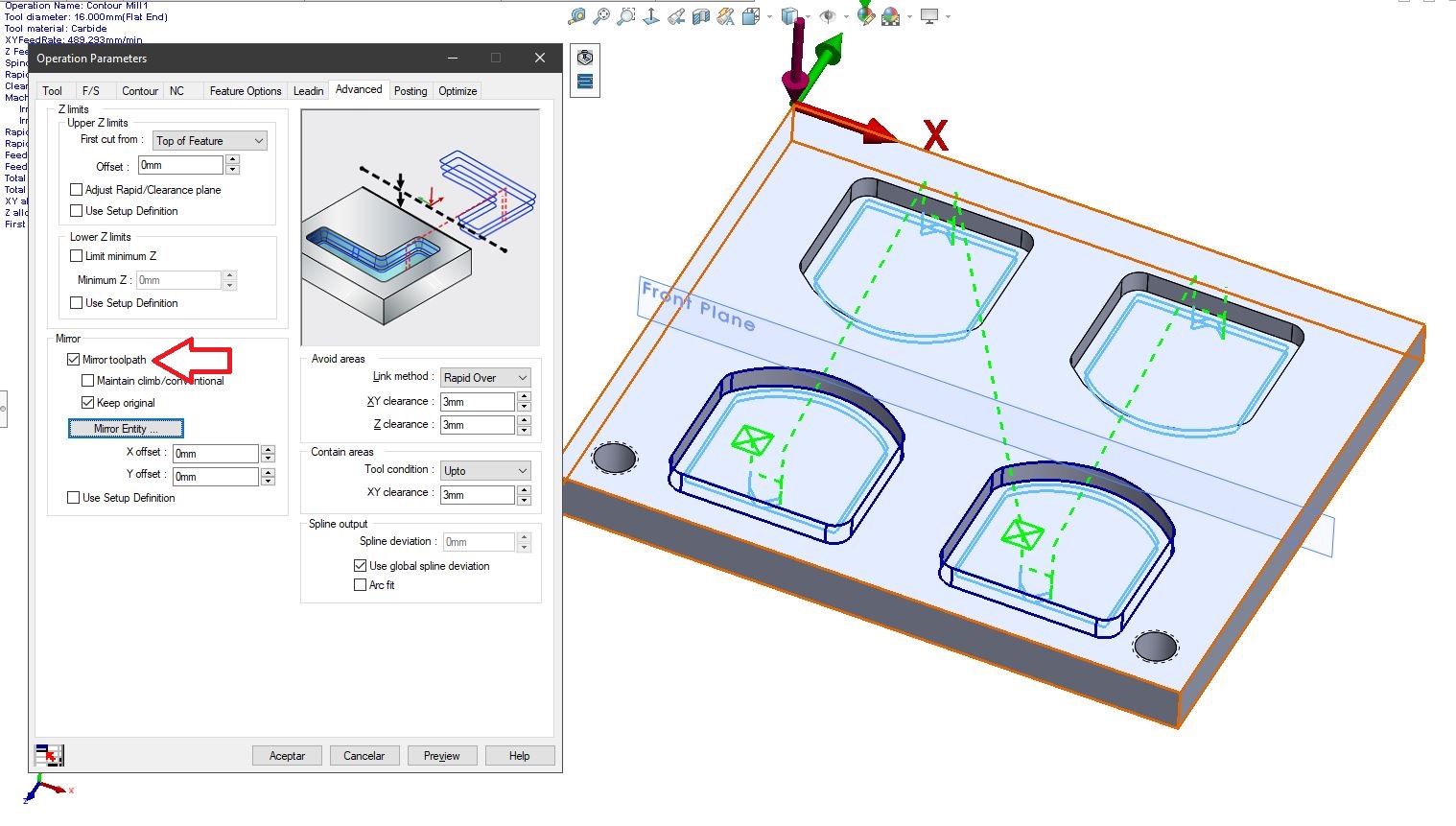 En el siguiente vídeo se explica como crear un espejo o simetría a partir de una operación simple o de varias operaciones combinadas en el mismo plano de trabajo o Setup.
