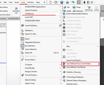 Para generar este archivo, se deberá abrir la operación “User Defined Tools and Holders” que se encuentra en el menú desplegable “Tools”>CAMWorks