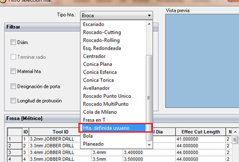 14. En la sección de tipo de hta. del filtro de búsqueda, seleccionar Hta. definida usuario, y seleccionar la herramienta y aceptar.