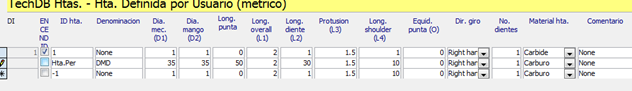siguiente información de la base de datos; Id. De la herramienta, Diámetro de