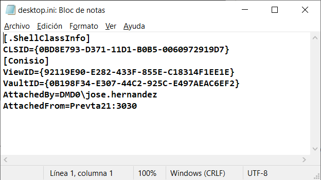 - Verificando el archivo llamado Desktop.ini, que está almacenado en la carpeta de vista local. Puesto que este archivo no está visible, se debe de utilizar el "Símbolo de Sistema" en donde se escribirá "/desktop.ini", al presionar Entrar, se nos mostrará la información que estamos buscando.