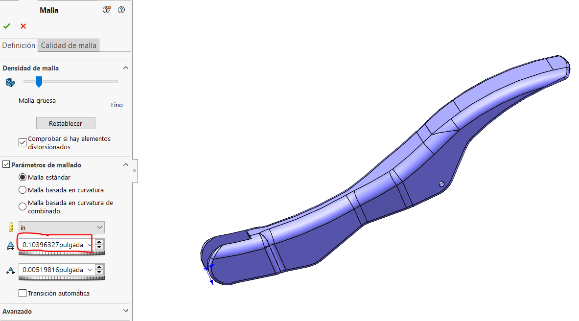 SOLUCIÓN: al generarse la malla en la pieza con los valores del ensamble concluimos que el tamaño de la malla en el ensamble NO es el problema. El problema de la malla en el ensamble puede deberse a diversas causas: problemas en el modelado de la pieza, superficies desconectadas, entidades demasiado pequeñas, incompatibilidad de caras.