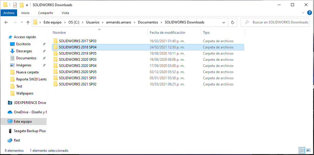 - Navegar y localizar el folder con los archivos de instalación de la versión de SOLIDWORKS requerida. Observe que en este ejemplo los archivos de instalación se han obtenido desde otro equipo y se han copiado a un disco duro.