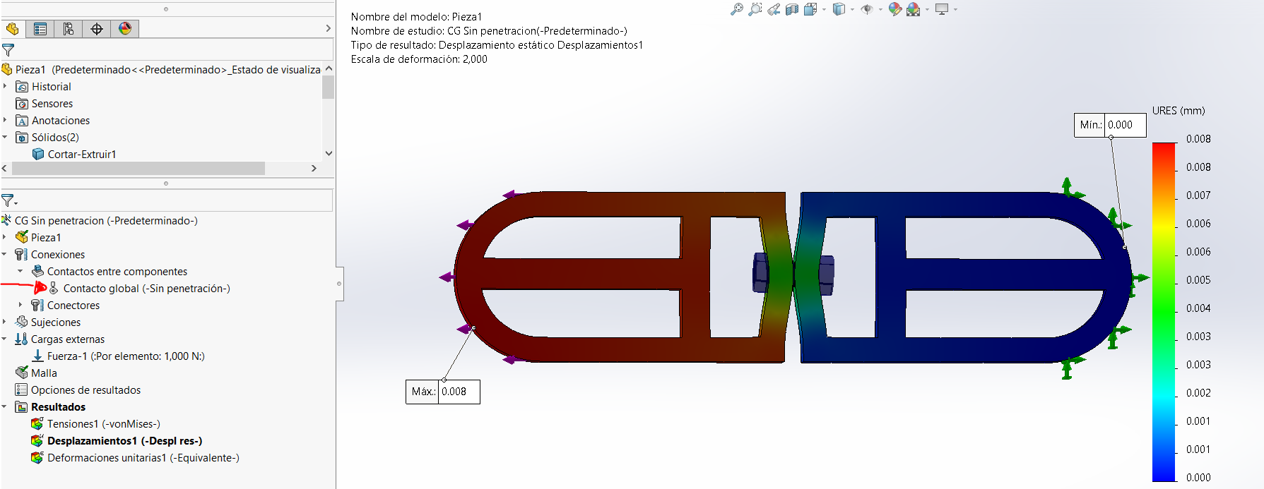 Observe ahora el resultado utilizando el contacto global con la opción de sin penetración (note que se ha definido un tornillo con el fin de tener la conexión entre las piezas):